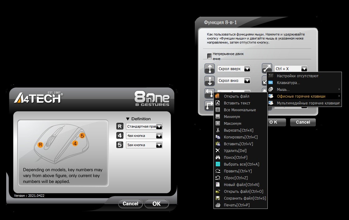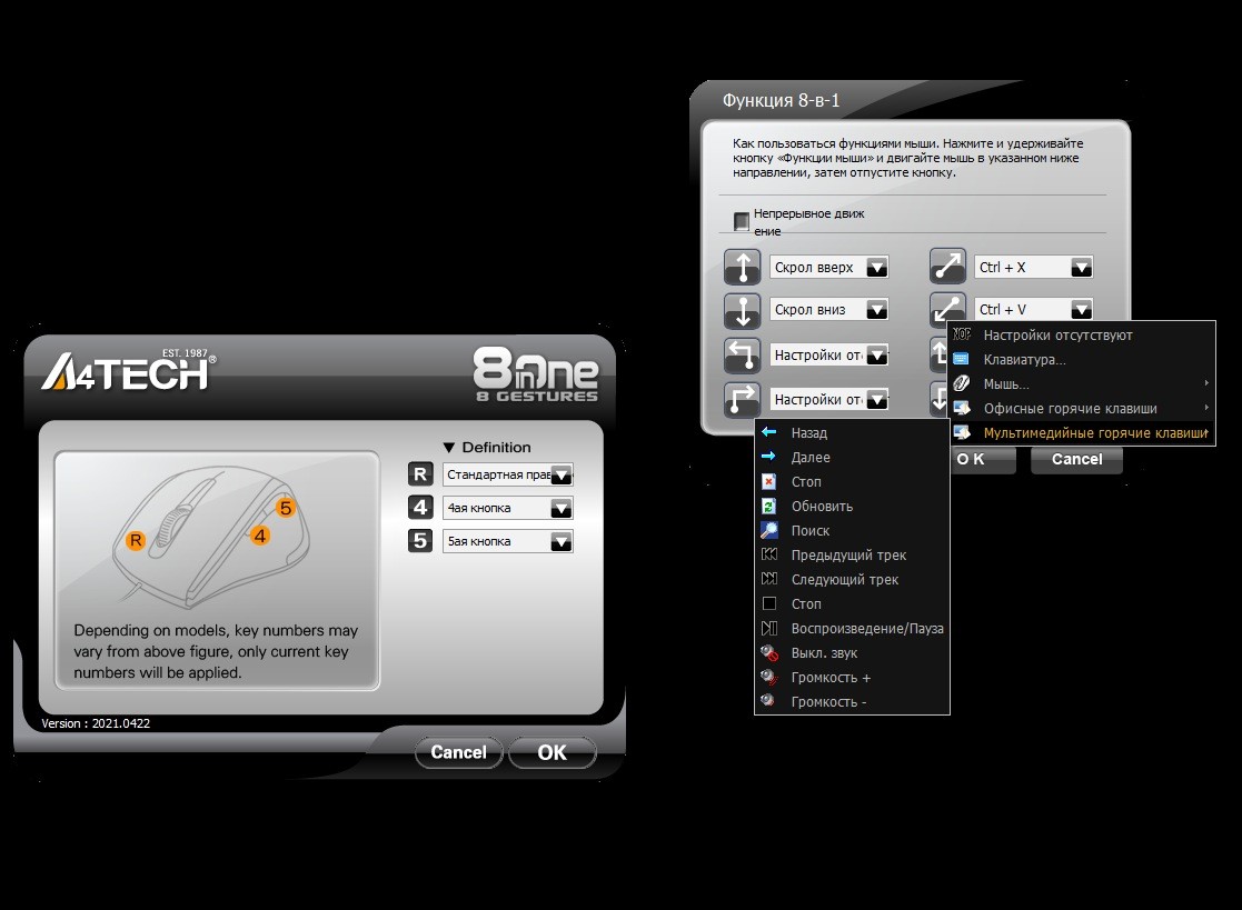 Комплект поставки Компактный пластиковый бокс с мышкой дополнен одной батарейкой АА, гарантийным талоном и вкладышем со списком основных характеристик. Дизайн и Корпус A4Tech - один из наиболее активных брендов в сегменте мышек из категории массовых беспроводных аксессуаров. Добиться такой популярности позволили качество и надежность товаров. Ну кто из нас хотя бы раз да не пользовался мышкой от этой компании? Вспомните свои впечатления! Накопленный опыт, и обратная связь с покупателями дают возможность инженерам и дизайнерам создавать удобные и универсальные мышки с достаточным набором функций. Модель FG12S точно из этого списка. A4Tech FG12S выполнена в корпусе из пластика. На выбор покупателя предлагается 3 варианта расцветки: черная, белая и черно-белая «Панда». Габариты 108 х 64 х 35 мм. Вес 63 г, со вставленной батарейкой 85 г. Пластик матовый на большей части корпуса. Это практично. Глянцем дизайнеры выделили только полоску вокруг колесика и разрыв между кнопками и местом упора ладони. Кнопки большие и беззвучные. Заявленный срок службы – 5 млн кликов. Колесико широкое и прорезиненное. Это удобно. Внизу переключатель вкл/выкл, обозначение модели и серийного номера, а также окошко сенсора. Разрешение оптического сенсора – 1200 dpi, частота опроса – 125 Гц. Достаточного размера тефлоновые ножки позволяют манипулятору хорошо скользить не только по коврику. Под крышкой место для установки батарейки и разъем для хранения приемника/передатчика, который работает на частоте 2.4 ГГц. Он оранжевого цвета. Субъективно, единственный плюс такой расцветки – USB-приемник сложнее потерять и легче найти. Опыт пользования Размер и характеристики беспроводной мышки A4Tech FG12S указывают на ее ориентацию на обычных пользователей, особенно на тех, кто будет использовать ее с ноутбуком и носить с собой. Получается, что манипулятор будет больше использоваться под офисные задачи и серфинг в сети. Реже для игр, 3D моделирования и других специфических задач, где для ускорения процессов хотя-бы пара-тройка дополнительных кнопок была бы не лишней. Для озвученных мной целей обозреваемой мышки хватает, производительность не идет в ущерб скорости или точности выполнения ежедневных функций. Плюсом могу назвать способность манипулятора работать на большинстве поверхностей, включая мягкую ткань дивана, гладкое стекло рабочего стола и деревянную основу кухонного. Полезная функция – 8 в 1. Пользователю дают слот из 8 жестов для настройки «горячих» клавиш мыши. Действие – зажатая кнопка и движение. Таким образом можно сделать многое – от увеличения громкости динамиков до копирования выделенного текста. Больше информации найдете на скриншотах ниже. Обозреваемая мышка, как бы это пафосно не звучало, идеальный партнер в путешествиях. Во-первых, из-за небольших габаритов. Во-вторых, благодаря возможности беспроводного подключения и длительного времени работы от одной батарейки. Производитель заявляет о сроке службы до 12 месяцев. Это реализовано за счет 4-х уровней энергосбережения и переходе устройства в спящий режим после 200 миллисекунд простоя. Не попробовав мышку в руке можно подумать, что небольшой размер — это некомфортно, но манипулятор удобен. Эргономичная симметричная форма означает, что пользоваться ею могут как левши, так и правши. Выводы A4Tech FG12S - очень простая мы