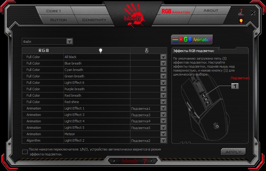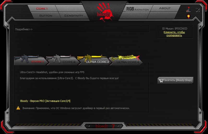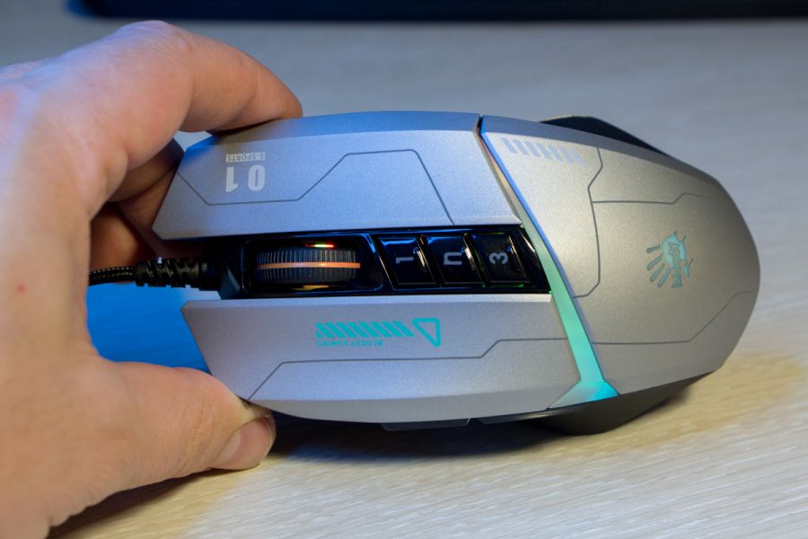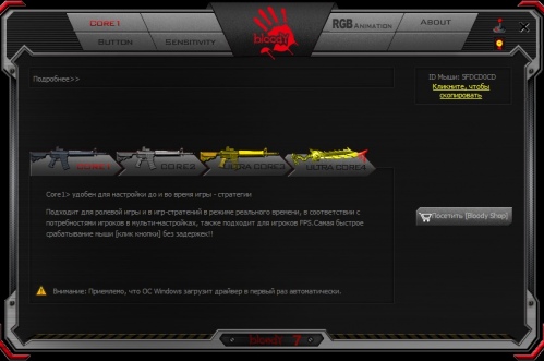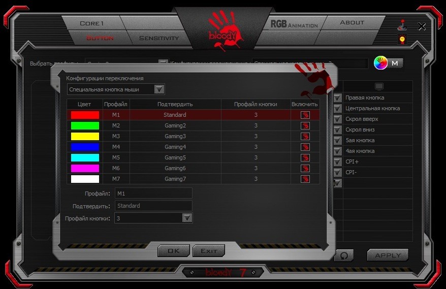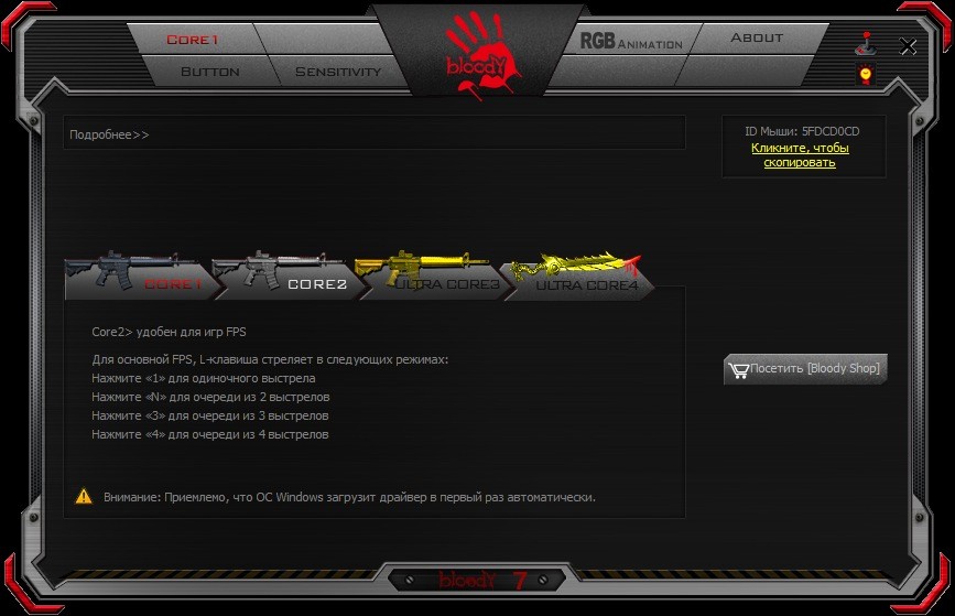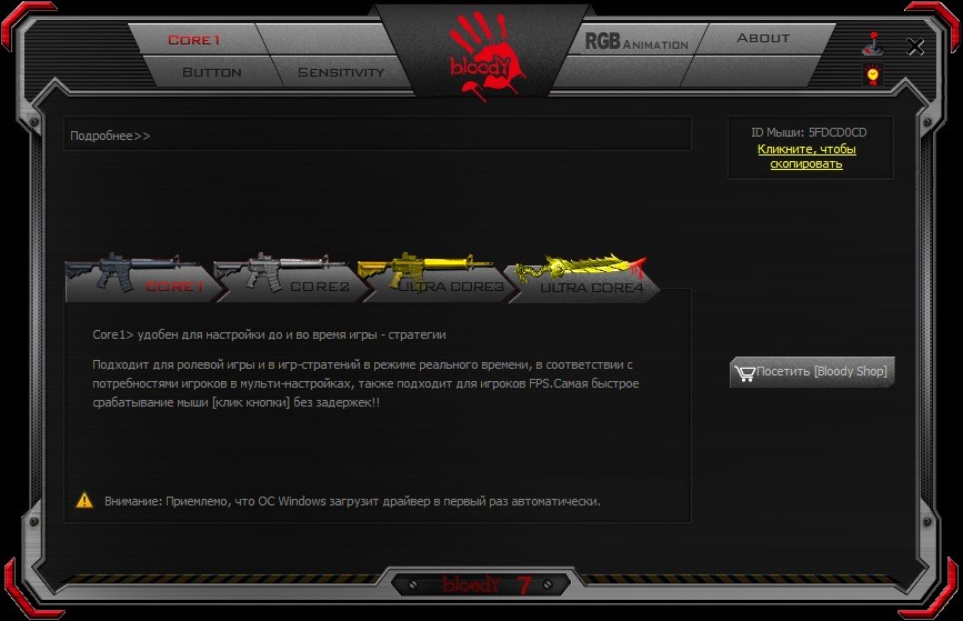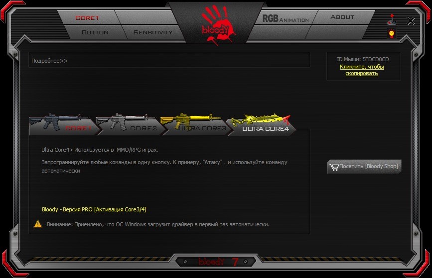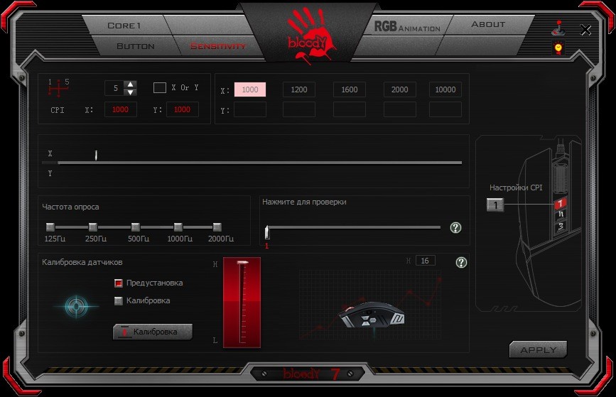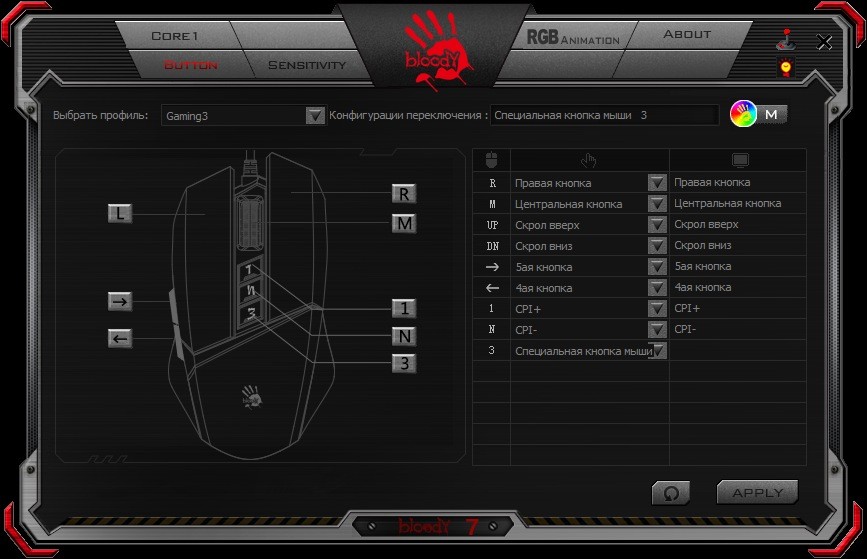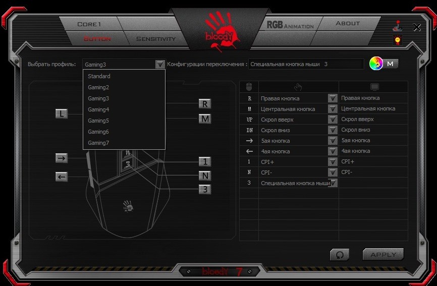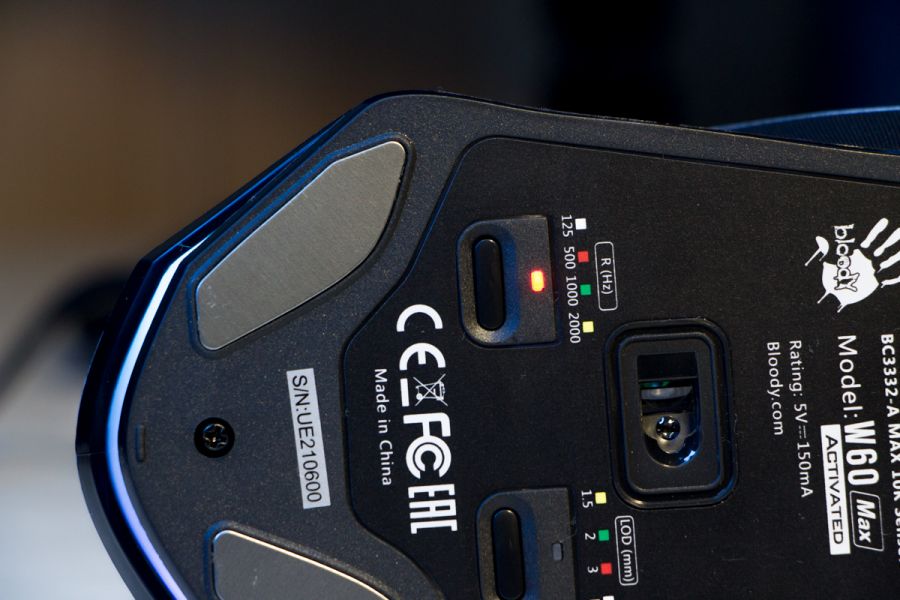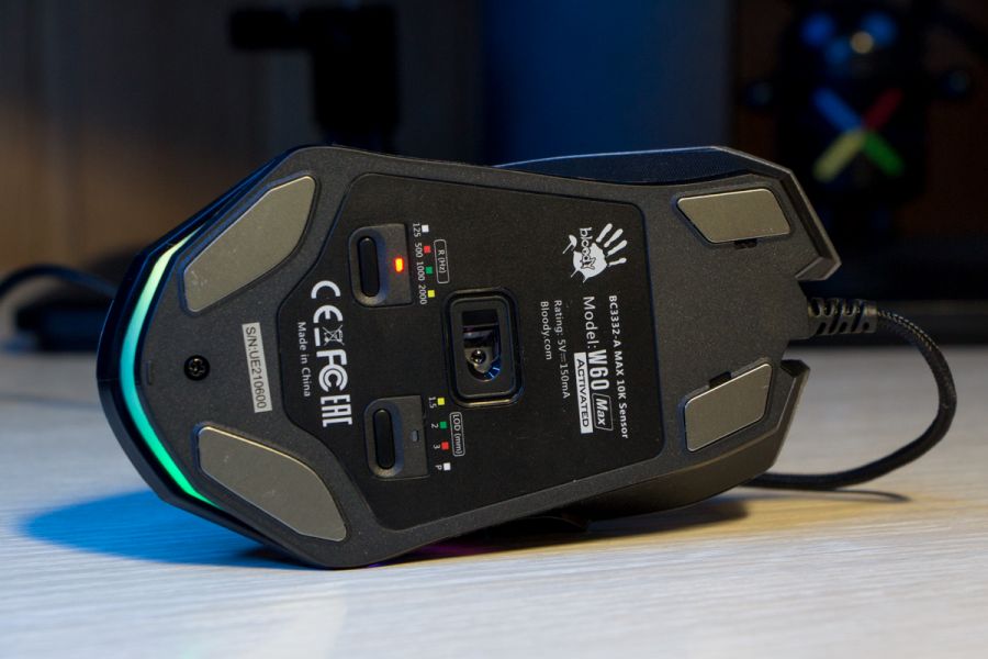 Комплектация Bloody W60 Max упакована в стандартную для бренда упаковку. Она не удивит, но раскроет все характеристики устройства. Также покупатель получает наклейки с логотипом Bloody и небольшое руководство пользователя. Дизайн и Корпус Корпус у Bloody W60 Max асимметричной формы. Это значит, что манипулятор не подойдет левше. Производитель выбрал интересный формат расцветки в серебре, черном и голубом оттенках. Материл практичный, немаркий, легко вытирается. Под указательный и средний палец разместили две обычные для мышки кнопки. Под большой палец добавили еще две продолговатые клавиши. Ресурс кнопок - 50 млн. кликов. Ближе к центру верхней части корпуса - вставка в виде молнии. Она полупрозрачная и с подсветкой. Это не единственное место, которое светится. Ниже в галерее можно оценить подсветку со всех сторон. Колесико широкое и также подсвечивается. Производитель заявил, что его ресурс – 500 тыс. вращений. Красиво смотрится подсветка логотипа Bloody. Формат подсвечивания можно менять небольшого размера кнопками с самой мышки. Это три клавиши под глянцевым черным пластиком на самом верху. Важно, что действия всех кнопок можно перенастроить через программу Bloody7. Справа и слева у присутствуют резиновые накладки для обеспечения удобного хвата. На нижней стороне манипулятора четыре металлические ножки. Их назвали X' Glide. Они не стираются, но идеально себе показывают на высоких разрешениях только ковриках. Хотя и на обычном рабочем столе, который покрыт лаком, особых замечаний к управлению у меня не возникло. Тут же снизу две кнопки. Они получили индикацию подсветкой и отвечают за высоту отрыва и частоту опроса сенсора. Эргономика мышки понравилась, сборка на высоком уровне, материалы подобраны грамотно. Расположение кнопок удобное. Кабель с нейлоновой оплеткой подключается по центру и на конце у него красного цвета USB-коннектор. ПО Bloody7 Если необходимо максимально подстроить мышку под себя, тогда без программного обеспечения не обойтись. Загружаем с официального сайта утилиту Bloody7. Она позволяет:
