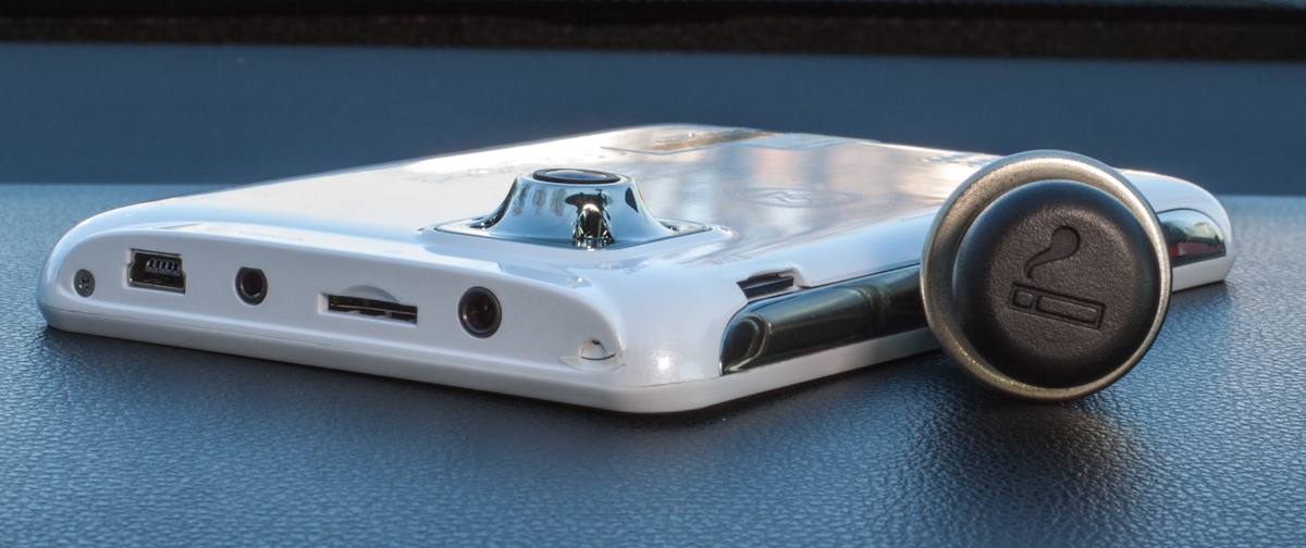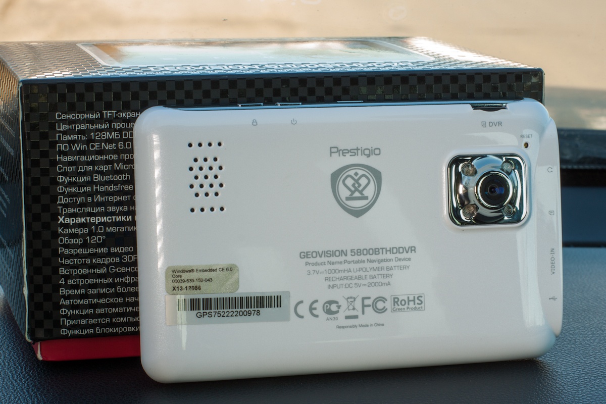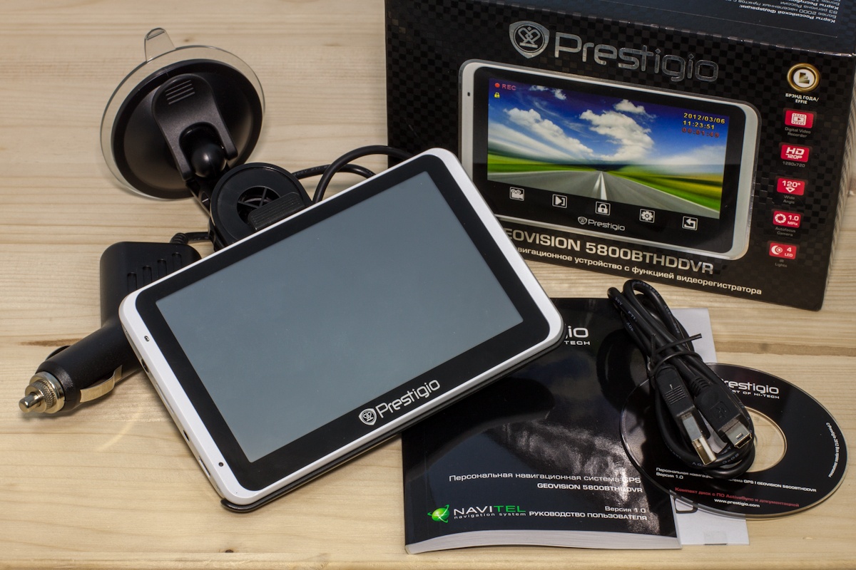 Обзор навигатора-регистратора Prestigio Geovision 5800BTHDDVRЕсли мы уже привыкли к тому, что на кухне у нас стоят комбайны, то со временем такие помощники в виде многофункциональных устройств осядут и в кокпитах многих автомобилистов. В этом обзоре познакомим вас с одним из первых автокомбайнов в своем классе - навигатором-регистратором Geovision 5800BTHDDVR от компании Prestigio. Комплект поставкиКомплект поставки включает в себя само устройство, крепление Prestigio Standart, кабель mini-USB/USB для синхронизации, автомобильное зарядное устройство, стилус и документацию. Карт памяти в комплекте нет. В идеале их нужно две. Одна непосредственно для записи данных с регистратора, вторая для хранения мультимедийных файлов. По поводу первой отметим, что производитель рекомендует выбирать скоростной класс не ниже 4-х, однако мы советуем брать «десятку» microSDHC. КреплениеВариант крепления устройства в автомобиле только один - на присоске к лобовому стеклу. Эта конструкция состоит из трех пластиковых элементов, собрать все вместе не составит труда. Весит она немного, а диаметра присоски хватает для удерживания навигатора. По крайней мере, у нас он ни разу не упал, однако советуем после установки проверять степень контакта. Вес самого устройства не маленький - 160 грамм. Чтобы снять максимально большой объем полезной информации перед «носом» машины, крепить устройство нужно выше, а значит ближе к водителю. Критично это в машинах с высоко задратым капотом, где баланс между удобством пользования навигатором и регистратором найти не так уже и просто. Недостатком крепления мы бы назвали невозможность поворота конструкции на большой угол. Чтобы записать общение, например, с работником ГАИ, необходимо будет снять либо все, либо только навигатор. В сильные морозы крепление вообще не советуем снимать, приклеить его обратно при -8 и ниже в холодной машине будет проблематично. Корпус и функциональные элементыЦвет корпуса белый с перламутровым отливом. Замечаний по качеству сборки и подборке материалов нет. Габариты, учитывая функциональность, довольно компактные - ширина 135 мм, высота 84 мм, толщина 12,5 мм. Хотя, лично я бы предпочел выбор цвета, и остановился бы на черном окрасе. Яркий корпус может отвлекать, а учитывая особенности монтажа, в некоторых автомобилях конструкция может находиться близко к водителю. На фронтальной части «разместился» экран, а слева от него вход микрофона и индикатор. На тыльной панели выпуклая область камеры регистратора, по периметру которой расположены четыре диода подсветки. Тут же динамик громкой связи и углубление под кнопку сброса настроек. На левый торец вынесено основные разъемы: 3,5 стерео джек, слот под карты памяти для хранения мультимедиа и навигационного ПО, вход Video-IN и miniUSB для зарядки. На верхней части «комбайна» имеются кнопки блокировки и питания, а также место для карты памяти, на которой будет храниться информация с видеорегистратора. Все входы и кнопки имеют обозначения, проблем при работе с ними не возникало. Единственное наше замечание – не совсем удачное расположение разъема питания. Если бы его разместили на правом торце или внизу, работать бы было куда комфортнее. Экран5-дюймовый LCD дисплей получил антибликовое покрытие. Разрешение экрана 800х480 точек, что довольно неплохо. Информация читаема даже при переизбытке света, достаточно т