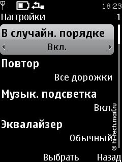 Поддерживаются следующие аудио форматы: AAC, AAC+, eAAC++, MP3, MP4, (SP)MIDI, (WB-)AMR, WMA, XMF. Эквалайзер 5-ти полосный, имеет две пользовательский настройки. Как и элементы интерфейса плеера, эквалайзер очень качественно прорисован, присутствует анимация. Есть режим расширенного стерео звучания, который находится в пункте меню Мультимедиа, но радикально его включение на качество звука не влияет. Доступны различные опции: деление по исполнителям, альбомам, жанрам и пр., повтор композиций и воспроизведение вразбивку. Управление осталось неизменным, переход к исполнителям, композициям осуществляется с помощью отклонений навигационной клавиши, все довольно просто и понятно.