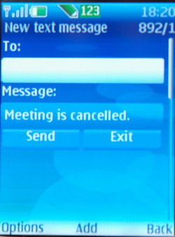 Новые сообщения включают SMS, MMS, открытку, быстрое и звуковое сообщение. При выборе абонента из телефонной книги высвечиваются все записанные для абонента номера. Отправить сообщение можно на любой из них или на все сразу. Ввод текста имеет свои особенности: первоначально строка ввода занимает на экране небольшое место, но по мере добавления текстовых строк это окошко увеличивается в размере за счет вертикальной прокрутки. Максимальное количество строк составляет 9. Максимальное число символов в сообщении 913, что составляет около 15 стандартных SMS на русском языке. Поддерживаются быстрые сообщения, которые не сохраняются в памяти при передаче. Создание MMS имеет свои особенности. В главном меню создания нового MMS существует несколько полей для ввода информации. В каждое поле можно вставить текст, картинку, аудиоклип, видеоклип, визитку, заметку и слайд. Создание сообщений электронной почты тоже выделено в отдельный пункт. В качестве вложений допускаются документы в формате doc, PDF, ppt, xls, картинки Jpeg, музыку MP3, видео 3GP и другие. Настройки