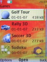 четырех выбранных по умолчанию городов на одном экране. ![]() В телефоне четыре установленных игры: Golf Tour, Rally 3D, Soccer 3D