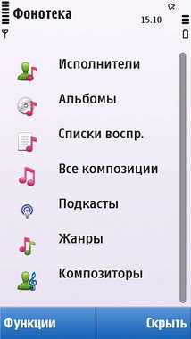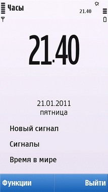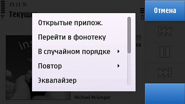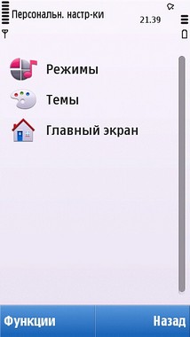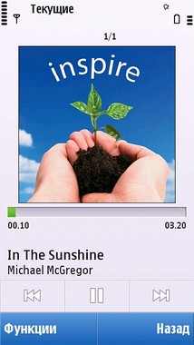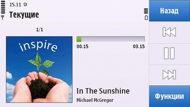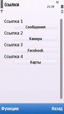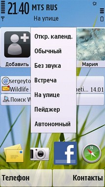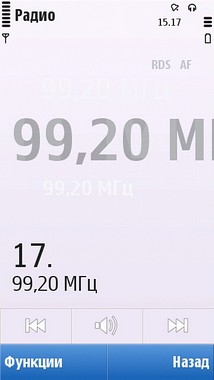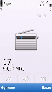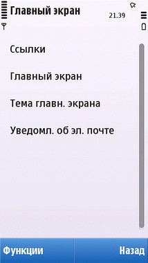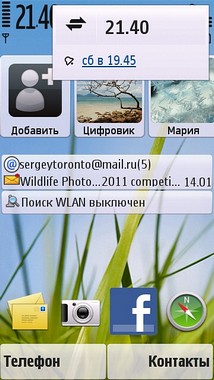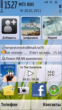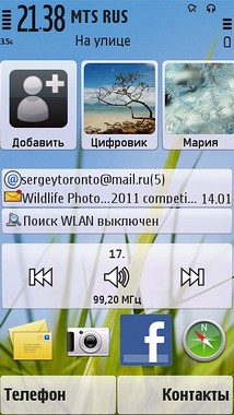 батареи, профиль выбранного звукового сигнала. Чуть ниже размещены иконки избранных контактов, информация о полученных электронных письмах и панель доступа и информации по WLAN-соединениям. Дальше - мультемедийный блок, в котором могут отображаться, например, кнопки управления аудиоплеером или FM–радио. ![]() В