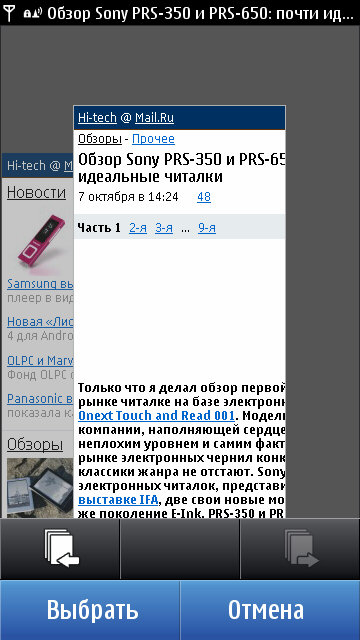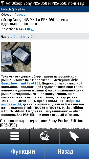 Браузер. В основе браузера лежит все тот же проект Konqueror, он поддерживает HTML 4.01 (полноценная работа с таблицами, фреймами, формами), JavaScript 1.5, CSS 1 и 2, RSS, flash-контент. Локализация браузера включает в себя поддержку 46 различных языков, однако не все языки поддерживаются любым телефоном. Как и в прошивках, здесь есть понятие "языкового пакета" - набора поддерживаемых языков в зависимости от региона продажи телефона. Русский язык поддерживается в полном объеме (KOI-8R, Windows-1251, UTF-8). Но все то, что было хорошо несколько лет назад, сейчас выглядит устаревшим, интерфейс браузера – главный недостаток текущих смартфонов с Symbian^3.