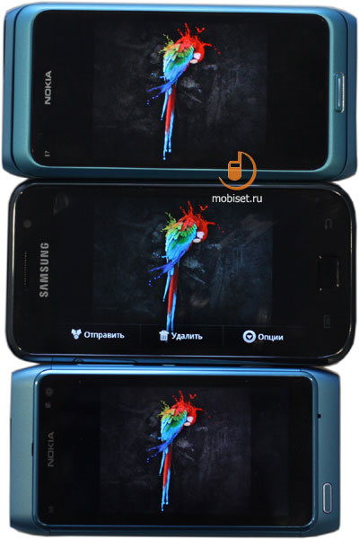 Обзор Nokia E7: первый взглядВ своё время небезызвестные модели Nokia N97 и N97 Mini стали пионерами форм-фактора бокового QWERTY-слайдера. Механизм доказал свою надёжность, и в 2010 году (с плавным переходом в 2011-й) конструкция используется в смартфоне Е7-00, который стал флагманом Eseries. ![]() ![]() Внешне устройство очень похоже на N8, в сложенном состоянии смартфоны крайне похожи друг на друга, настоящие близнецы, различия обнаруживаются лишь в некоторых нюансах. ![]() ![]() В силу своих размеров (устройство крупное, но достаточно тонкое) и ряда спецификаций Е7-00 будет интересна ограниченному кругу пользователей. Смартфон заинтересует пресловутый бизнес-сегмент, который нуждается в подобных девайсах для удобной и разносторонней коммуникации. ![]() Внешний вид Стиль N8 используется и в Е7-00, мне такой дизайн нравится, он приятен глазу и свеж. Большой и красивый телефон собран качественно, материалы аналогичны N8. Корпус металлический, экран под стеклом. Лишь верхний и нижние торцы выполнены из пластика. ![]() ![]() ![]() ![]() Размеры составляют 123.7 x 62.4 x 13.6 мм, весит коммуникатор 176 гр. Устройство большое и крупное, но в то же время и достаточно тонкое, время монстрообразных «кирпичей» уходит в прошлое. ![]() ![]() ![]() Количество расцветок по сравнению с N8 более скромное. По сети «гуляли» фото вариантов в салатовом и оранжевом цветах (воодушевляющие оттенки!), но в России в серию смартфон пойдет лишь в двух расцветках: темно-серой и серебристой. Возможно и появление такого варианта, что приведен на прилагаемых фотографиях, в синем цвете. ![]() ![]() ![]() Вверху находится кнопка включения устройства, разъём 3.5 мм для подключения комплектной гарнитуры или собственных наушников. Здесь же нашлось место для mini-HDMI разъема, при помощи которого можно просматривать данные из телефона на большом экране в отличном качестве. Там же находится microUSB-порт. ![]() ![]() На левом боку видно небольшой рычажок, с его помощью осуществляется блокировка и разблокировка экрана. ![]() ![]() С противоположной стороны находятся слот для SIM-карты, который представляет собой и крепление для самой карты. Необходимо закрепить ее и вставить в телефон. Никаких дополнительных приспособлений при этом не требуется. ![]() Чуть ниже видно другой рычажок, который регулирует громкость. И последней деталью стала клавиша запуска камеры. ![]() ![]() Над дисплеем находятся камера для видеозвонков, датчики освещения и приближения. ![]() Под экраном находится клавиша «Меню». ![]() ![]() ![]() Корпус монолитный, задняя крышка несъемная, а значит, аккумулятор из устройства извлечь не получится. На тот случай, если устройство зависнет (всякое бывает), можно прибегнуть к перезагрузке, зажав кнопку на несколько секунд, – принцип, как у N8. На задней части смартфона имеется углубление, в котором находится объектив камеры и светодиодная вспышка, причем в силу упрощенности конструкции блок с камерой не выступает за пределы корпуса (как в N8). Внизу видно отверстие динамика. ![]() ![]() ![]() Е7-00 настолько качественно и плотно собран, что не с первого раза можно понять, что телефон вообще может иметь подобную сложную раскладывающуюся конструкцию. Нет ни малейшего намека на люфт, смартфон сделан практически как единое целое и это очень здорово, качество изготовления превосходное. ![]() ![]() ![]() ![]() ![]() ![]() ![]() Главная черта Е7-00 – это клавиатура, которая позволяет отнести устройс