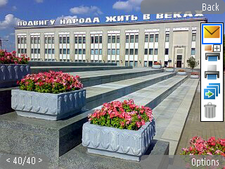 Меню и основные функции устройств на базе Symbian 9.1 с интерфейсом S60 подробно разобраны в обзорах аналогичных моделей, поэтому обратим внимание на самые интересные и уникальные возможности N73. В первую очередь интересна галерея, ведь именно там хранится весь отснятый материал. Программа позволяет не только получить доступ к медиаколлекции, но и автоматически составить музыкальное слайдшоу с красивыми переходами, которое можно сохранить как видеоклип. Мультимедийные файлы можно отправить друзьям через MMS (автоматически урезается до нужных размеров), Bluetooth, ИК-порт или же загрузить в интернет (сервис Flickr). Приятен именно факт автоматизации процесса: не требуется чего-то придумывать, выбирать эффекты переходов, компоновать слайды или вырезать видео. Нужно только подобрать музыку, а остальное сделает умная программа. Результаты впечатляют качеством и интересностью. В обычным режимом просмотра больше пользоваться не хочется. Примечательно, что программа работает в полноэкранном режиме с повернутым на 90 градусов дисплеем, делая просмотр предельно удобным.