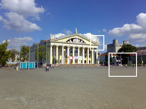Настраиваемый режим представляет собой модификацию любого из предустановленных и является профилем настройки всех возможных параметров, кроме таймера и режима серии снимков. Изменить можно режим вспышки (автоматически, всегда включено, коррекция красных глаз, выключено), баланс белого (автомат, солнечно, пасмурно, лампа накаливания, флуоресцентная лампа), экспозицию (+/–2Ev), цветовые эффекты (обычный, сепия, черно-белый, негатив, яркий), светочувствительность (3 градации + автомат). При выборе параметров в окошке предварительного просмотра демонстрируется полученный результат. Можно переключиться на фронтальную камеру, но за исключением двукратного зума здесь настроить ничего не получится. Основная камера не поддерживает оптическое увеличение, зато программное достигает 20х. После съемки фотографию можно сразу добавить в фотоальбом или предварительно просмотреть. Разрешение фото – 2048х1536, средний размер файла – 800-900 Кб. Видеорежим особым богатством настроек не отличается. Режимов съемки всего два: обычный и ночной. Зато варианты выбора баланса белого и цветовых эффектов унаследованы в полной мере. Возможна съемка обеими камерами (не одновременно, конечно). Выбор качества съемки влияет на формат файла: при наилучшем получается файл mp4, среднее или низкое позволяют снимать в 3GP. Полезен режим стабилизации видео, позволяющий избавиться от рывков. Аудио сжимается AAC-кодеком с битрейтом 132 Кбит/с, 32 кГц. Видео сжимается в mpeg4, битрейт 700-800 Кбит/с, разрешение 352x288.