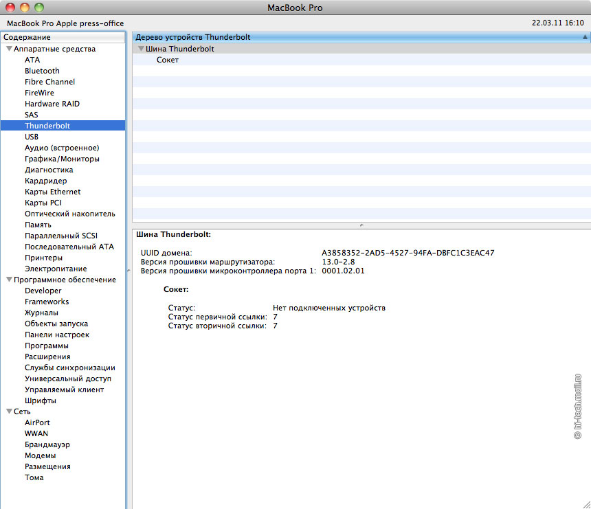 Порты и разъемыКоличество и расположение портов у модели MacBook Pro 2011 года также не изменилось, за исключением одно нюанса — в новинке фирменный Mini Display Port совмещен с высокоскоростным портом нового поколения Thunderbolt. Под наименованием Thunderbolt скрывается технология Light Peak, представленная компанией Intel в 2009 году и позволяющая передавать данные на скорости 10 Гбит/с. Если перевести сухие цифры в более понятные значения, то при скорости 10 Гбит/с полнометражный фильм в HD-качестве скопируется менее чем за 30 секунд.
