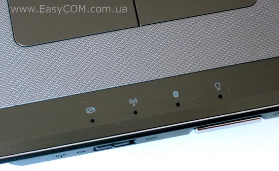 Над клавиатурой с правой стороны находится небольшая вставка из шлифованного металла, на которой расположились две клавиши. Одна из этих клавиш просто включает и выключает ноутбук, а вот вторая более функциональна, хоть и имеет всего два положения. С ее помощью можно изменять параметры производительности и энергопотребления ноутбука (в оболочке ОС Windows), либо же запустить мини-ОС Express Gate (при нажатии на клавишу во время старта ноутбука), возможности и преимущества, которой опишем ниже. Немного выше над вставкой находятся четыре светодиодных индикатора, показывающих состояние Lock-клавиш (Num, Caps и Scroll) и обращение к жесткому диску.