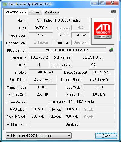 Выбор конкурентов производился по схожести характеристик в общем, но в основном было сравнение интегрированной ATI Radeon HD 3200 с некоторыми дискретными ускорителями. Для начала посмотрим, что нам говорит встроенный тест в операционной системе.