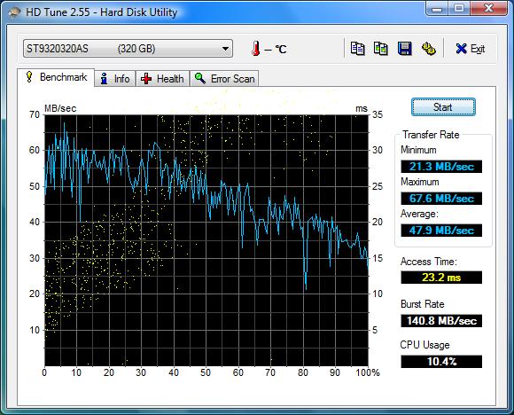 Производительность ноутбука в целом неплоха, но интегрированная видеокарта, все-таки, значительно понижает общий рейтинг. По остальным параметрам претензий нет, здесь мощный процессор, достаточно большой объем оперативной памяти, емкий жесткий диск, т.е. все, что нужно большинству пользователей, особо не акцентирующим внимание на играх. Накопители Программа HD-Tune была использована для получения информации о дисковой подсистеме ноутбука. В ноутбуке установлен жесткий диск Seagate ST9320320AS емкостью 320 Гб и со скоростью вращения шпинделя 5400 об/мин.