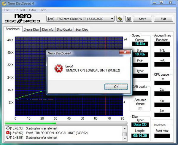В ноутбуке используется оптический привод, способный считывать и записывать информацию «с» и «на» диски CD/DVD. В тестируемом образце был установлен привод TSSTcorp CDDVDW TS-L633A. Результат чтения старого поцарапанного диска не увенчался успехом, долго мучаясь, система таки выдала окошко с ошибкой.
