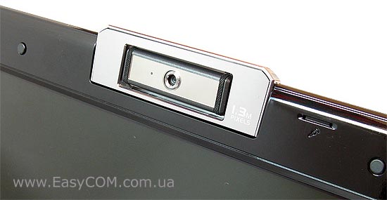 Над дисплеем находится встроенная вэб-камера с разрешением модуля 1,3 мегапикселя, обрамленная широким металлическим кантом. Она имеет возможность вращения, что для многих будет приятным моментом, т.к. не надо будет изменять положение всей крышки ноутбука для того, чтобы попасть в кадр. Правее, за пределами канта, находится двухсторонний микрофон.