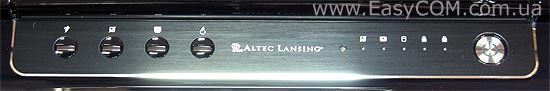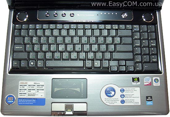 Клавиатура, используемая в ноутбуке, полноразмерная, к тому же присутствует отдельный цифровой блок клавиш. При работе с клавишами не возникает никаких проблем, они очень удобны и хорошо продуманы. Всего в ноутбуке насчитывается 102 клавиши, и они имеют черный матовый цвет. К приятным особенностям стоит отнести удачное нанесение символов. Так для латиницы применен белый цвет, для кириллицы – бирюзовый, а для функциональных обозначений - голубой. Кроме этого стоит учесть и расположение клавиш <Ctrl> и <Fn>, из которых первая находится с краю. Над клавиатурой расположена специальная вставка, на которой размещены дополнительные клавиши и индикаторы, а также здесь находится клавиша включения ноутбука и красуется логотип Altec Lansing. Клавиши отвечают за отключение тачпада и смену режимов производительности, цветовых настроек дисплея и энергопотребления. Индикаторы показывают такие состояния: отключение тачпада, получение новой почты, обращение к жесткому диску, и активность Lock-клавиш (Num и Caps).
