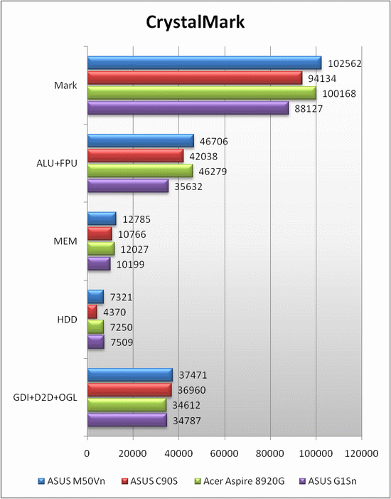 Элементы энергообеспечения ноутбука являются собственными продуктами ASUS, поэтому не стоит сомневаться в их качестве и надежности. Блок питания ADP-90SB BB (90 Вт, 19 В, 4,74 А) без проблем справляется со своей задачей. Температурный режим БП находится где-то на уровне 40-50 градусов Цельсия. Аккумулятор A32-M50 (11,1 В, 4800 мАч, 53 В*ч) основан на 6-элементной литий-ионной батарее. Тестирование Чтобы понять, насколько новинка производительна, мы провели тестирование всех компонентов системы, для чего были использованы популярные bench-пакеты. Впоследствии, полученные результаты мы сравнили с результатами, протестированных ранее ноутбуков: