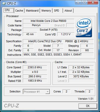 Благодаря программе CPU-Z, мы получаем информацию о частотных характеристиках ядра установленного процессора, его множителе и возможностях, а также информацию об оперативной памяти и материнской плате.
