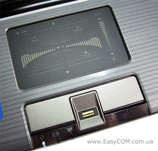В ноутбуке установлена специальная сенсорная панель, способная работать в двух режимах, а именно в роли указывающего устройства или мультимедийного пульта управления. Данное нововведение довольно спорное и может вызвать как приятные ощущения, связанные с хорошей чувствительностью и возможностью вертикальной и горизонтальной прокрутки, так и негативные. Причина кроется в том, что переключение режимов находится в верхнем правом углу панели, а при активной работе с тачпадом практически не избежать случайного нажатия. Как обычно, немного ниже сенсорной панели расположены две клавиши, отвечающие за ЛКМ и ПКМ. Между ними находится биометрический датчик, позволяющий считывать отпечатки пальцев.