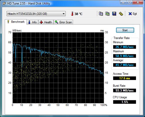 Результаты тестирования ноутбука ASUS M50Vn, как и предполагалось, получились очень высокими. Это позволяет надеяться на то, что он справится с любыми задачами и даже многими играми. Накопители Программа HD-Tune была использована для получения информации о дисковой подсистеме ноутбука. В нем используется жесткий диск Hitachi HTS543232L9A300 емкостью 320 ГБ и со скоростью вращения шпинделя 5400 об/мин.