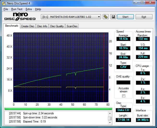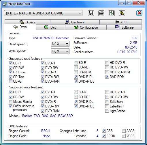 Оптический привод MATSHITA DVD-RAM UJ870BJ, используемый в ноутбуке, способный как считывать, так и записывать информацию на CD и DVD-диски. Для получения информации об основных возможностях привода и тестирования на чтение царапанного диска, были использованы утилиты Nero.
