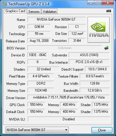 Видеоподсистема основывается на базе NVIDIA GeForce 9650M GT c 1 ГБ собственной памяти. Она обеспечивает высокое качество изображения и значительную производительность, как в простых офисных приложениях, так и в требовательных 3D играх, нуждающихся в поддержке DirectX10. Данный GPU имеет поддержку технологий PureVideo HD, Hybrid SLI, CUDA и NVIDIA PhysX.