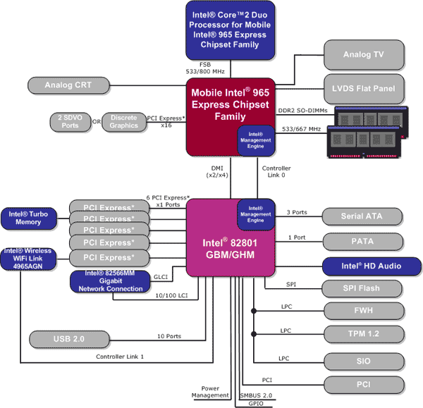 Управление компонентами системы осуществляется благодаря чипсету Intel GM965 Express, отличительными чертами которого являются интегрированный видеоадаптер средней производительности Intel GMA X3100, поддерживающий DirectX 9.0c и обеспечивающий неплохую работу с трехмерной графикой, а также расширенная поддержка воспроизведения HD-файлов. Помимо этого, чипсет имеет поддержку двухканальной памяти DDR2-667 с возможностью расширения до 4 ГБ. Для поддержки внутренних устройств и периферии используются шесть портов PCI Express x1 версии 1.1, до десяти портов USB 2.0, а также два SATA и один PATA. Среди используемых технологий стоит отметить: Intel Clear Video, которая обеспечивает высокое качество воспроизведения видеофайлов, повышенную четкость изображения и возможность индивидуальной настройки цветовой палитры; Intel Active Management Technology, предоставляющая новые методы управления удаленными клиентами для бизнес-приложений. Внешний вид и эргономика