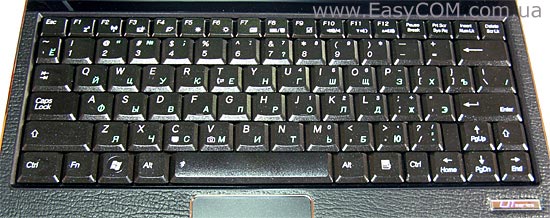 Почти всю площадь рабочей зоны, за исключением клавиатуры и тачпада, занимает вставка из натуральной кожи черного цвета, довольно приятной на ощупь. Клавиатура же, установленная в ноутбук полноразмерная, практически не претерпевшая существенных изменений, но как бы того не хотелось, они есть, и в основном касаются расположения блока стрелок. Он расположен вровень со всеми клавишами, из-за чего может появиться вероятность ошибочного нажатия на прилегающие клавиши, в частности небольшую по размерам клавишу правого [Ctrl], и несколько не стандартно расположенную клавишу правого [Shift]. Хотя, при наборе текста данное расположение будет довольно удобное, если сравнивать с полноценной клавиатурой. В остальном же расположение клавиш нареканий не вызывает, кнопки удобные и имеют приятный небольшой ход с характерным щелчком в конце. Всего клавиатура насчитывает 83 клавиши. Кстати, к приятному моменту стоит отнести расположение правого [Ctrl] и функциональной клавиши [Fn], где [Ctrl] находится с краю, что понравится новичкам. Также положительным момент является хорошее нанесение символов. Так для латиницы применен белый цвет, для кириллицы – бирюзовый, а для функциональных клавиш – голубой.