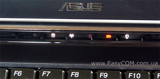 Над клавиатурой по центру находится блок индикаторов, отображающий такие состояния: активность клавиши [Caps Lock], обращение к жесткому диску, активность беспроводных сетей Wi-Fi и Bluetooth, заряд аккумулятора и наличие подключения к сети.