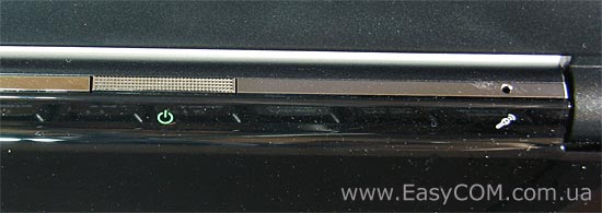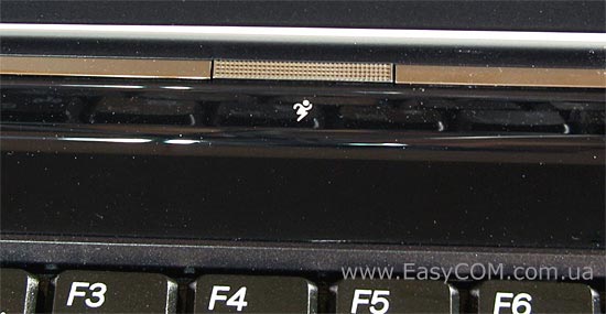 Еще выше, на кромке, расположены две рельефных клавиши и отверстие микрофона. Клавиша, расположенная ближе к правому краю ноутбука, отвечает за его включение. Клавиша слева – за переключение между режимами производительности/энергосбережения.