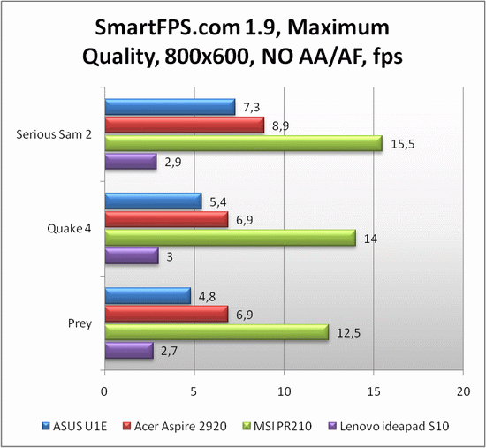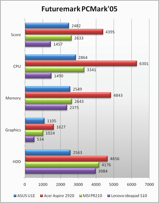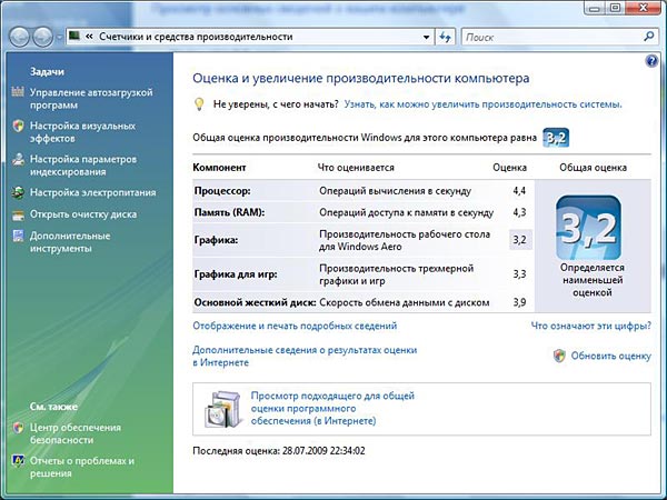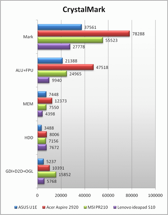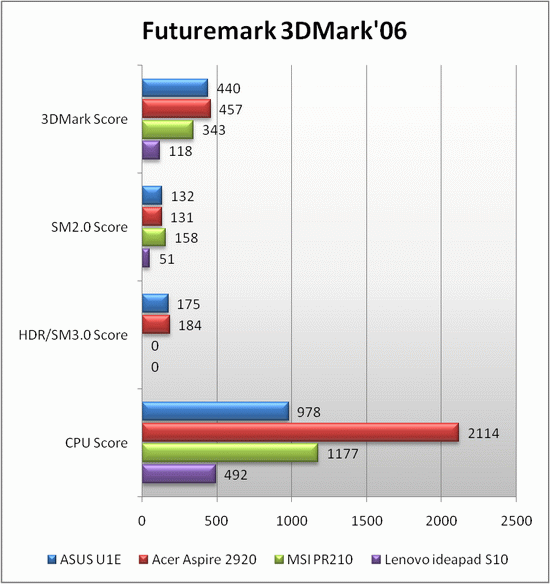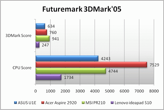 Для подключения ноутбука к сети используется блока питания SADP-65KB (65 Вт, 19 В, 3.42 А), произведенный компанией DELTA ELECTRONICS, INC. Температура БП во время работы находится на среднем уровне, только лишь при подзарядке аккумуляторов он становится немного горячее, но не настолько, чтобы стояло сильно переживать. Для автономной работы используются две аккумуляторных батареи, являющиеся собственным продуктом ASUS. Первая из них A31-U1 (11,1 В, 2400 мАч) основывается на 3-элементной литий-ионной батарее, вторая же A32-U1 (11,1 В, 4800 мАч) 6-элементной литий-ионной батарее. Тестирование Первым пунктом отметим, что говорит встроенный тест в ОС Windows Vista о производительности ноутбука ASUS U1E.
