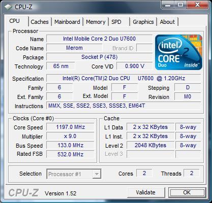 «Сердцем» ноутбука является двухъядерный процессор Intel Core2 Duo U7600, изготовленный по 65 нм техпроцессу, который работает на частоте 1200 МГц при FSB 533 МГц, что наглядно демонстрируем с помощью утилиты CPU-Z. Такого процессора, конечно, будет недостаточно для игр, но для работы с документами и онлайн-конференций его возможностей должно быть достаточно.