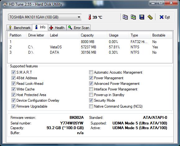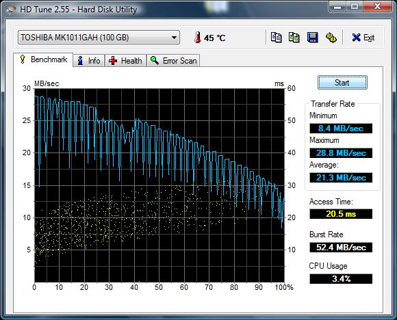 Производительность ноутбука ASUS U1E довольно высокая, если брать во внимание нужды целевой аудитории продукта. Если говорить об общем положении, то видно, что устройство занимает промежуточное место между полноценными ноутбуками и нетбуками, хотя ближе таки к последним. ASUS U1E с легкостью позволяет работать с любыми офисными приложения, просматривать видео, прослушивать аудио. А вот на трехмерную графику рассчитывать не стоит. Накопители Программа HD-Tune была использована для получения информации о дисковой подсистеме ноутбука. В нем используется жесткий диск PATA 1,8" TOSHIBA MK1011GAH емкостью 100 ГБ. Скорость вращения шпинделя составляет 4200 об/мин.