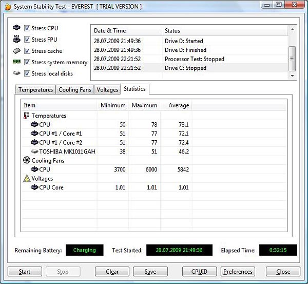 Для определения температурных показателей ноутбука во время работы мы использовали встроенную утилиту тестирования стабильности в программе Everest, способную осуществить высокую нагрузку всех компонентов системы. Выяснилось, что ноутбук довольно сильно греется, к тому же уже через примерно 10 минут работа установленного кулера становится слишком слышимой, что может не понравиться истинным ценителям тишины. Поэтому не нужно возлагать на ASUS U1E тяжелых задач, а также придется следить за доступом воздуха к вентиляционным отверстиям. Автономная работа С помощью программы Battery Eater мы замерили время автономной работы ноутбука. Замер происходил в нескольких режимах: