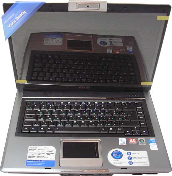 Экран тоже достойно подчеркнул возможности всей системы. Обозреваемый образец имеет зеркальную матрицу, позволяющую выводить яркое и контрастное изображение насыщенных цветов, но эта особенность обеспечит наличие бликов на панели экрана, что слегка неудобно при работе. В общем, «картинка» довольно четкая, обеспечивающая достаточный комфорт пользователя непосредственно перед экраном ноутбука. Технология выполнения матрицы позволяет изображению остаться таким же четким и не изменять цветовую гамму, даже при отклонениях угла зрения от перпендикуляра к поверхности дисплея. Горизонтальный угол обзора, стандартно для ноутбуков от компании ASUS, большой. Отметим, что в угоду компактности широкоформатная матрица монитора довольно мала и имеет размер 15.4". Работа за таким экраном вполне комфортна и достаточно приятна. Сразу под экраном расположена клавиатура на 89 клавиш, большая часть которых не подверглись уменьшению, следовательно, не приходится целиться, чтобы попадать. Русские буквы выделены светло-зеленым цветом, что очень удобно при работе в плохо освещенном помещении. Комфортной подставкой для кистей рук во время работы служат области вокруг тачпад, который отличается хорошей чувствительностью и возможностями вертикальной и горизонтальной прокрутки, хотя горизонтальная на нем не обозначена. Вверху возле самого экрана находится блок управляющих кнопок. Остальные функции по управлению громкостью звука, яркостью экрана, работы беспроводной сети и другие возможности активируются через клавиатуру функциональными клавишами – клавиша Fn крайняя левая внизу и одна из нужных клавиш в верхнем ряду с функцией, обозначенной голубым цветом. Небольшие динамики над клавиатурой обеспечивают среднюю громкость, как для ноутбука. Подсоединив достойную аудиосистему к цифровому выходу, можно добиться качественного звучания. Блок питания и аккумулятор