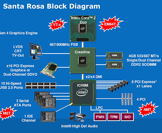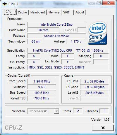 Скриншот из программы CPU-Z, позволяет наглядно продемонстрировать частотные характеристики установленного процессора, его множитель и спецификацию, а также частоту шины материнской платы. А главное можно непосредственно убедиться, что установленный в эту модель процессор действительно соответствует заявленным особенностям платформы Santa Rosa от компании Intel, – это кэш L2 до 2048 Кб и повышение рабочей частоты системной шины до 800 МГц с 677 МГц.