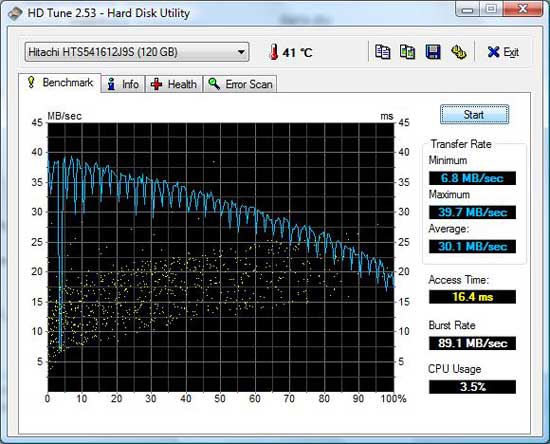 Используя программу HD-Tune, приведем скоростные характеристики чтения дисковой подсистемы ноутбука.