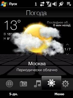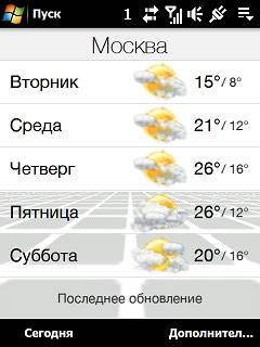 В самом низу мы видим информацию о времени последнего обновления погоды. Правая софт-клавиша открывает меню настроек, где можно добавлять населённый пункт, удалять выбранные, сбросит информацию о погоде с текущего города, обновить информацию. Дополнительные настройки: фаренгейт или Цельсий; включение автоматического обновления прогноза; включение обновления погоды в роуминге; Следующие элементы скрытого меню: