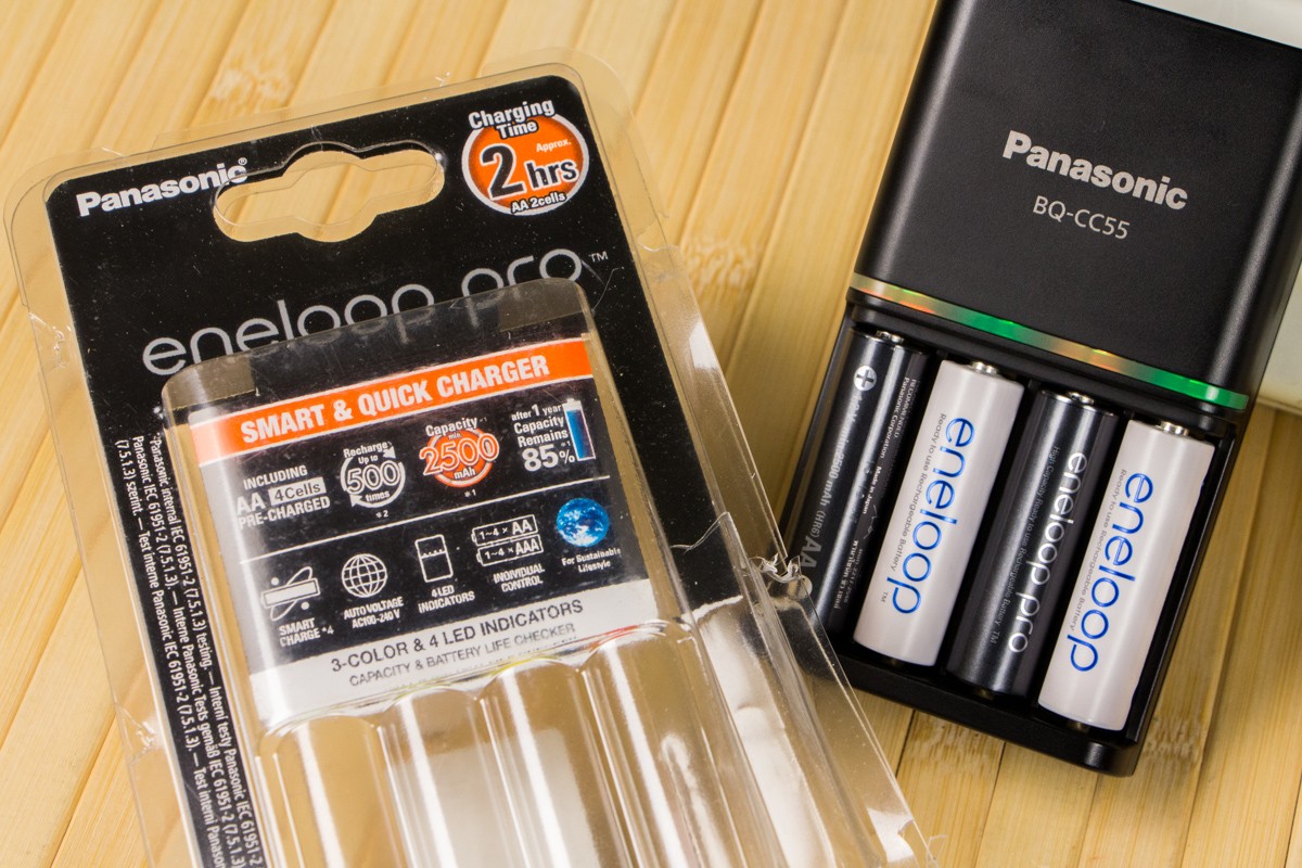 Для тех, кто ценит точность, отметим, что ток заряда составляет 1600 или 800 мАч при работе с АА батареями и 600 или 300 мАч при подключении AАА аккумуляторов. Покупатель вправе использовать с зарядным устройством продукцию других производителей, так что временные показатели могут отличаться. Хотя идущие в комплекте 4 AA аккумулятора eneloop pro смогут покрыть потребности практически любых пользователей. Их с пользой можно эксплуатировать в вспышках к фотоаппаратам, непосредственно в фотокамерах, в пультах для автомобилей, детских радиоуправляемых игрушках и других устройствах. Ведь емкость одной такой батареи составляет 2500 мАч и перезаряжать ее можно до 500 раз без боязни потерять в качестве и уровне напряжения, которое она отдает. Подробнее о линейке eneloop мы писали в этой статье. Для справки, ранее у нас были аккумуляторы емкостью 2450 мАч, а в комплекте с Panasonic BQ-CC55 уже идут на 2500 мАч. При этом сохранились основные преимущества данной продукции: