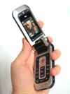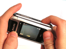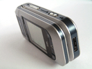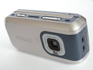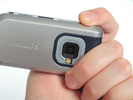 Обратная сторона телефона – самый настоящий фотоаппарат. Ведь форма корпуса такова, что Philips 760 может быть как мобильным телефоном, так и цифровым фотоаппаратом. Вот мы и дошли до самого интересного – того, что скрывает в себе необычная форма раскладушки. Итак, задняя часть телефона – графически оформленный фотообъектив (он выделен цветом, и защищён несколько утопленной резиновой каёмкочкой-блендой). Вокруг объектива – надписи о регалиях линз, внизу – маленькое окошко фотовспышки-фонарика. Рельефная вдавленная надпись Philips возле объектива добавляет баланса и, опять же, показывает всем, от кого у вас в руках мобильная техника. Ориентация надписи и кнопок на боку телефона говорит о том, что его нужно держать, как обыкновенный фотоаппарат. Но как же сделать так, чтобы телефон превратился в цифровую камеру? Ведь на оборотной стороне объектива – крышка с зеркальцем. Всё очень просто: открываем мобильный, поворачиваем по вертикальной оси верхнюю часть, ту, которая с дисплеем и, таким образом, отворачиваем дисплей от нас. Затем закрываем телефон – voila! – и вот у нас в руках уже нормальный с виду фотоаппарат. Пальцы удобно ложатся сверху на клавиши, спуск фото нажимается очень удобно, не жёстко, но и не слишком мягко, а регулятором звука можно управлять фонариком, которые работает вместо вспышки. Кстати, он полуавтоматический, и, включив его, он через 15 секунд сам выключится.