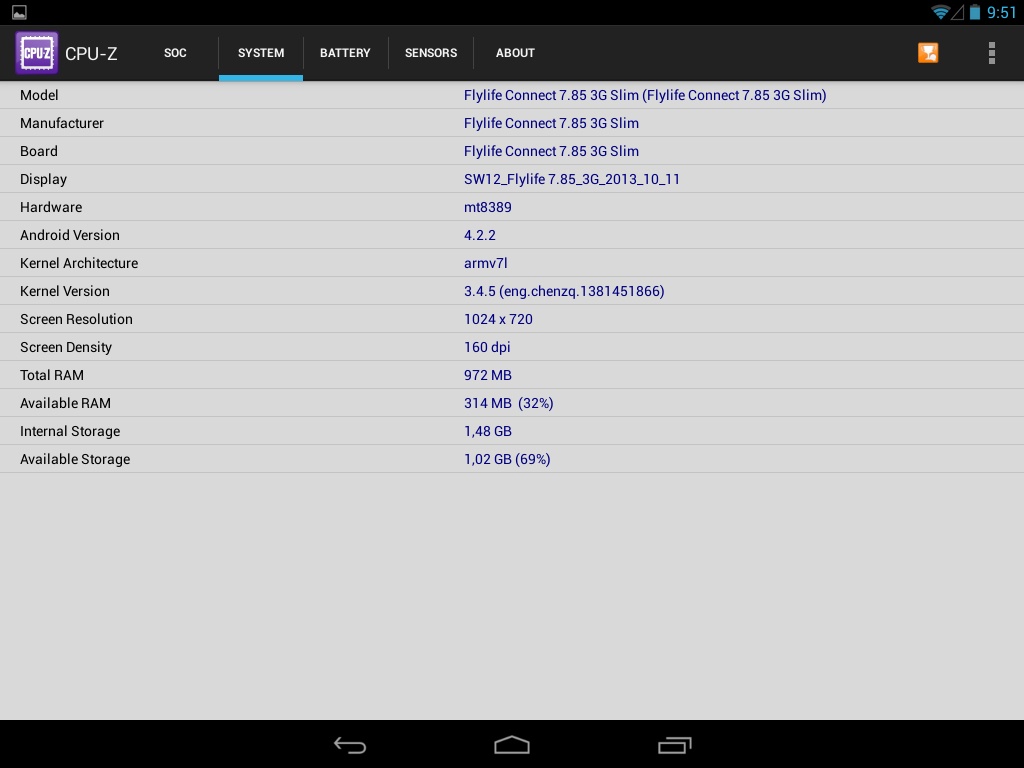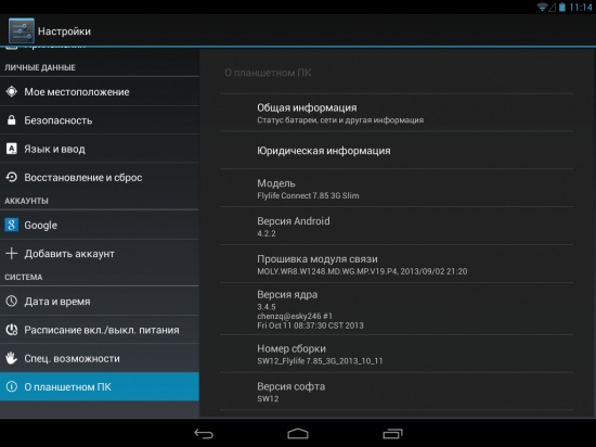 Работает планшет под управлением операционной системы Android 4.2.2 «из коробки». Об обновлении платформы до более актуальной версии на данный момент информации нет, что логично, поскольку устройство только начало продаваться. Однако, учитывая политику, которой придерживается Fly, увидеть Android 4.3 или 4.4  на этом планшете, скорее всего, мы не сможем.