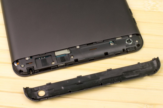 Помимо металла на тыльной панели имеется небольшая пластиковая вставка. Она съемная и «прячет» за собой несколько функциональных элементов. Но об этом ниже.