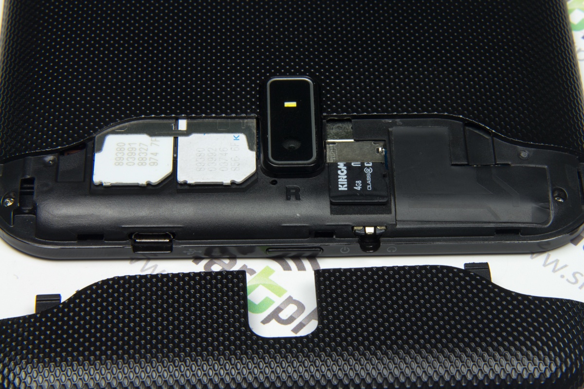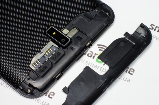 Слоты для двух SIM карт (GSM/WCDMA) плюс MicroSD карты, а также кнопку Reset производитель спрятал под небольшую съемную крышку в верхней части тыльной панели.