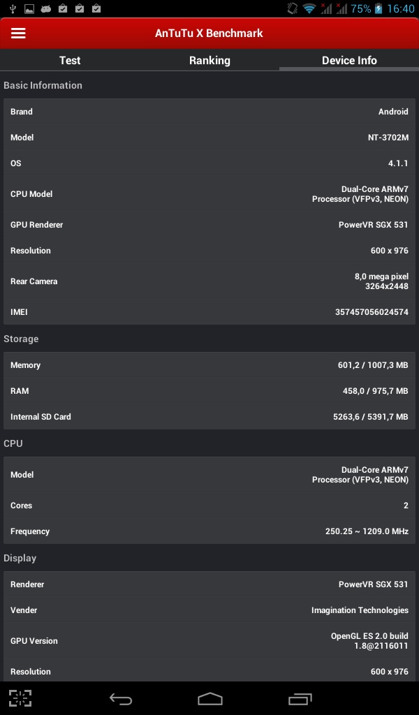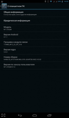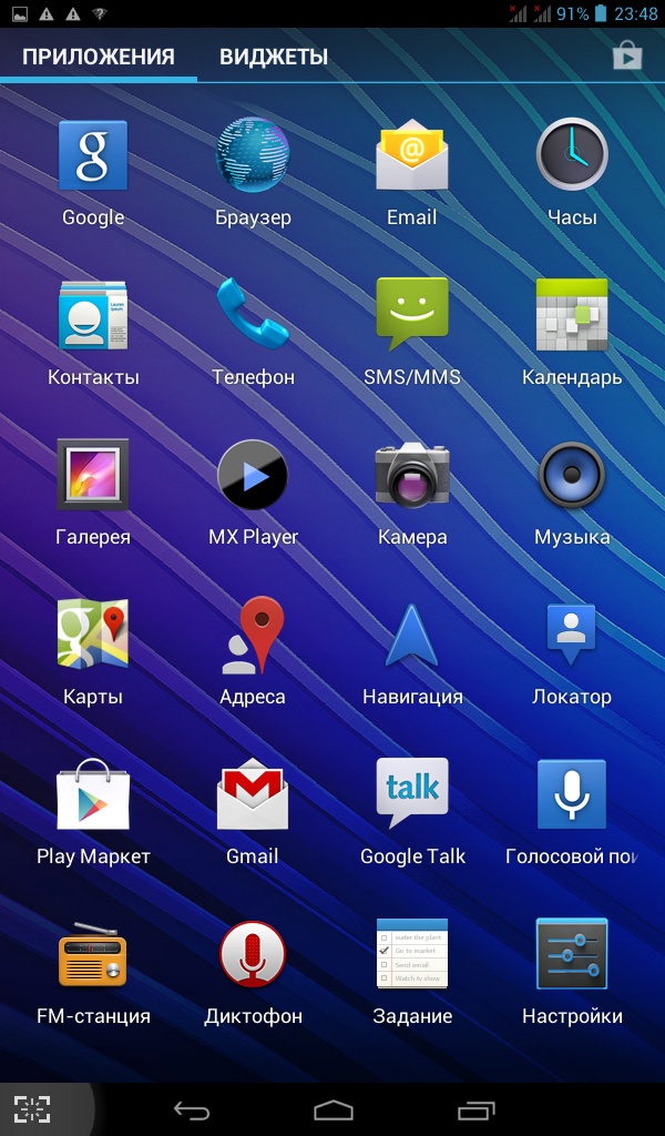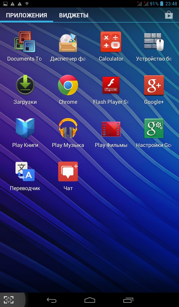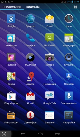 Планшет работает под управлением Android OS 4.1.1. Присутствует минимальный набор стандартных приложений - Gmail, Карты, Google +, Play Музыка, Play Фильмы, Chrome, MX Player, Задание и Documents To Go и несколько других.