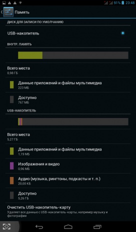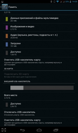 Из 8 ГБ официально заявленной встроенной памяти пользователю доступно порядка 5 ГБ. При необходимости ее можно расширить с помощью карт памяти формата microSD до 32 ГБ или же подключив внешний накопитель посредством переходника USB OTG.