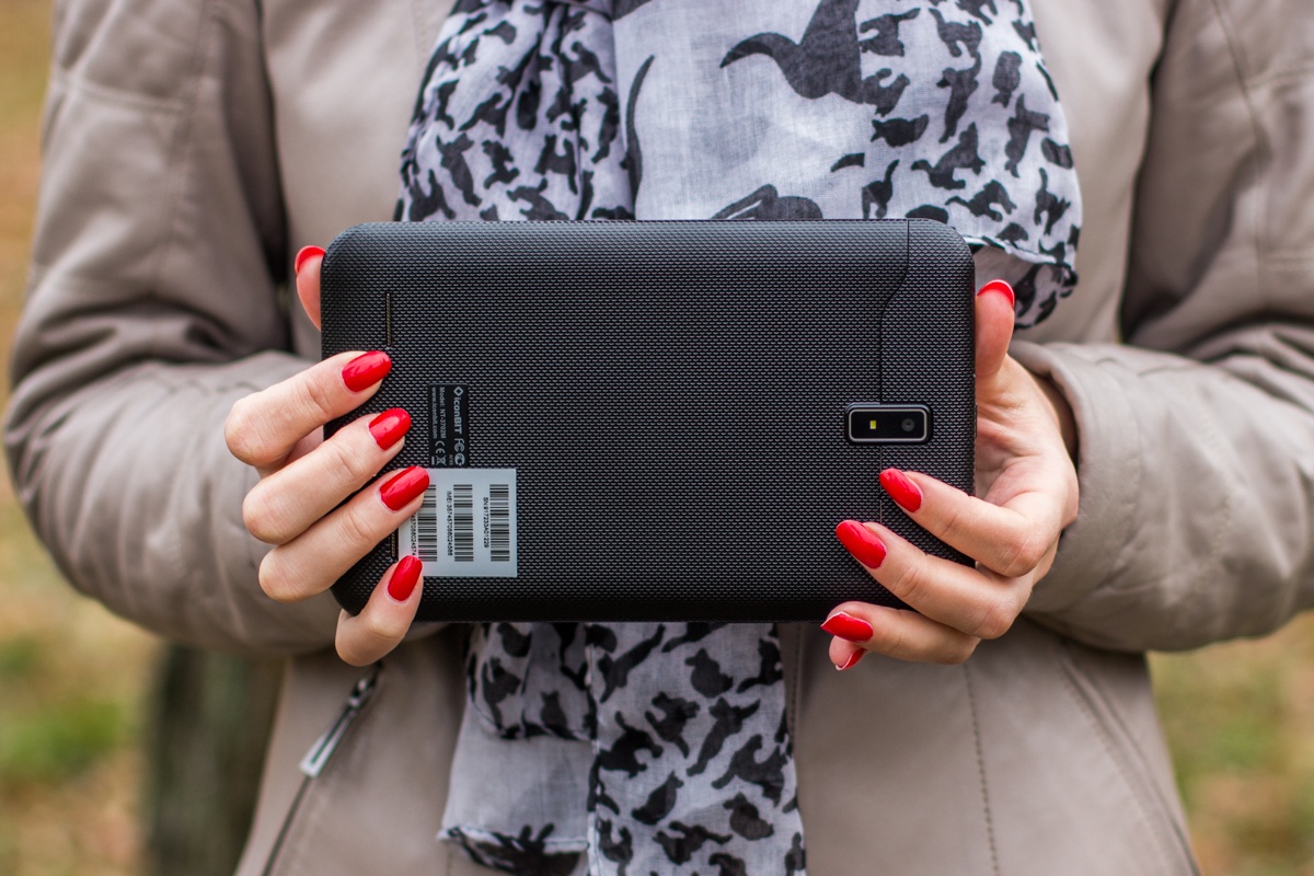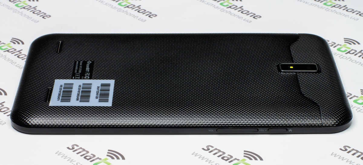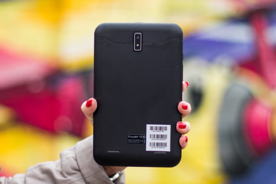 Лицевую сторону планшета занимают 7-дюймовый дисплей и прорезь разговорного динамика с глазком 2Мп фронтальной камеры над ним.