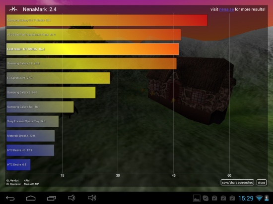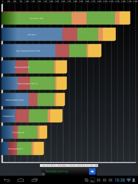 В бенчмарках планшет показал хорошие результаты для своей начинки. Причем после установки Android 4.2.2 показатели определенно выросли. К примеру, если до обновления планшет в популярном AnTuTu набирал чуть более 17 тысяч баллов, то после уже более 18 тысяч.