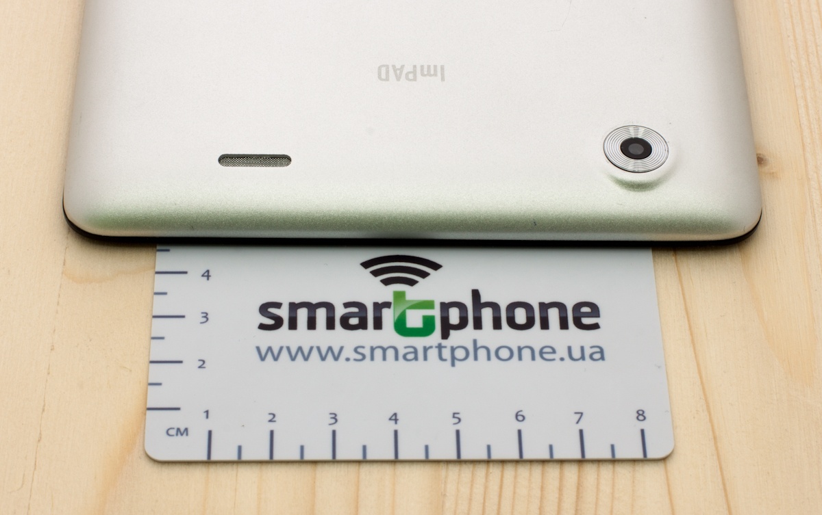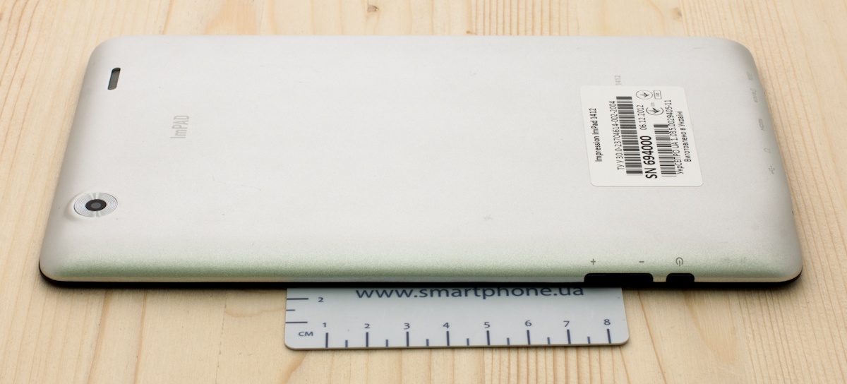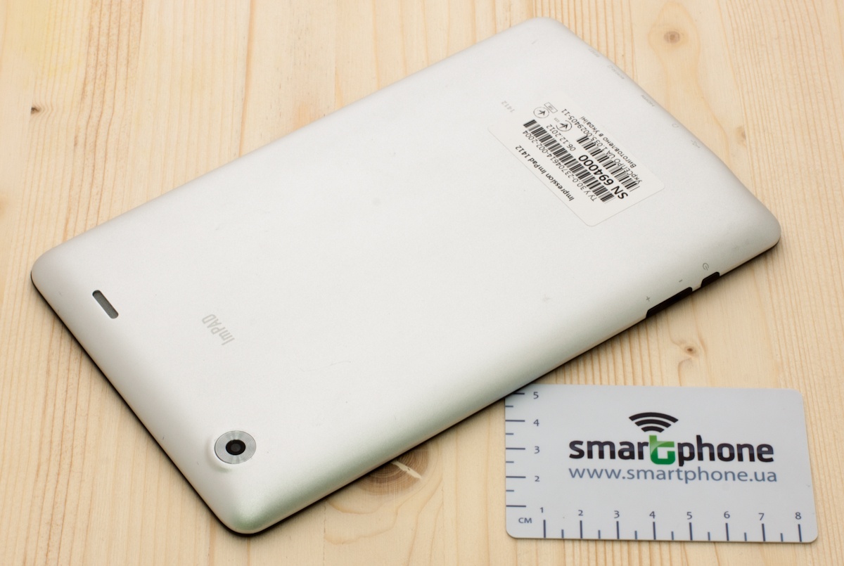 Внешность Impression ImPad 1412 оставляет приятное впечатление. Задняя поверхность устройства, а также все его углы немного скругленные. Основа корпуса, включительно с задней панелью, выполнена из матового пластика серебряного цвета. На задней панели сверху находится 2-мегапиксельная камера и единственный динамик. Кроме того, здесь же можно найти надпись ImPad и служебную информацию о планшете.