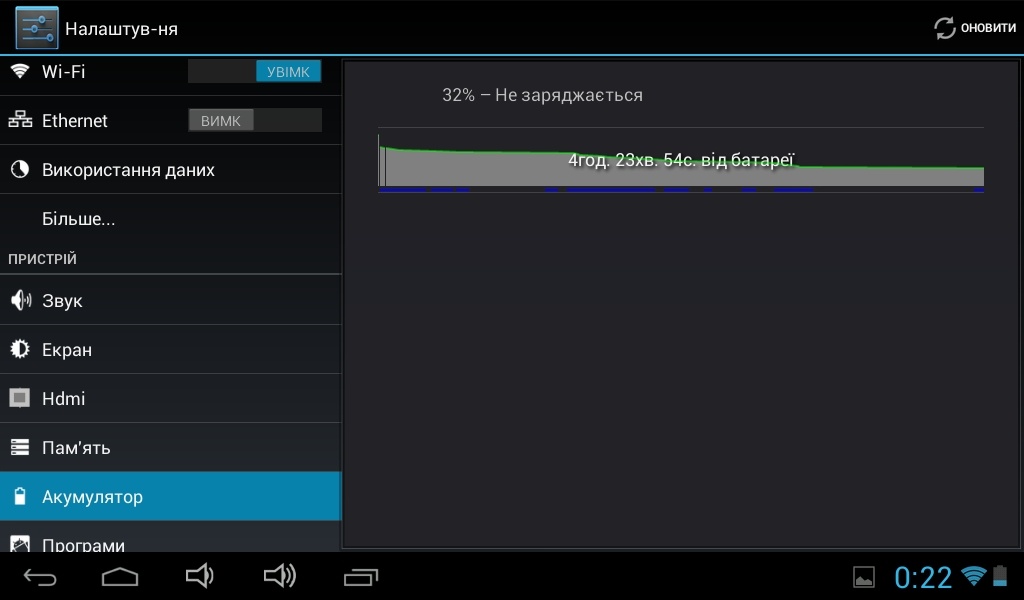 Относительно автономной работы ImPad 1412, то тут дела обстоят вполне неплохо. Емкость аккумулятора устройства составляет 3600 мАч. В режиме беспрерывного воспроизведения видео или игр батарея планшета продержалась не больше чем 3,5 часа. При активном изучении интерфейса и веб-серфинге 100% заряда мне хватило на 5 часов. При эпизодическом использовании устройства в разных режимах одного заряда батареи может хватить и на целый день.