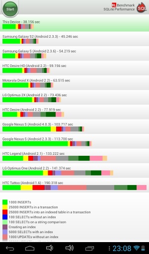 Решив замерять производительность нашего тестируемого устройства, мы воспользовались некоторыми тестовыми приложениями с Google Play Market, среди которых AnTuTu Benchmark, Quadrant Standard, SQLite Performance и NenaMark2 (v2.2) . А вот и их результаты: