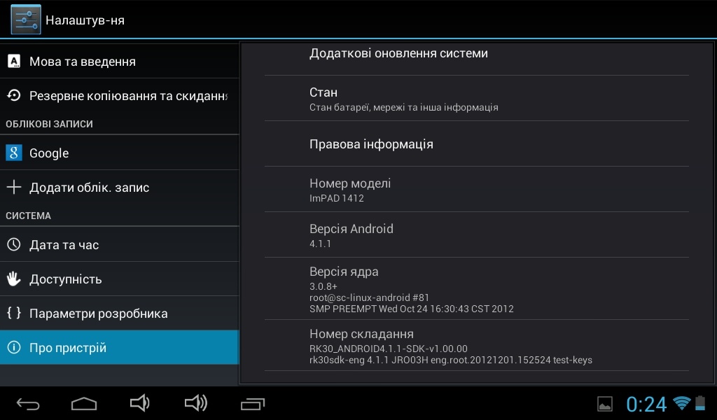 Impression ImPad 1412 работает под управлением ОС Android 4.1.1.