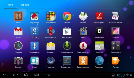 Среди предустановленного на планшет ПО: браузер Chrome, поисковик Google, приложения Вконтакте и Одноклассники, букридер и медиаплеер и много других полезных программок. А все остальное, что может пригодиться на планшете, можно загрузить с Google Market.